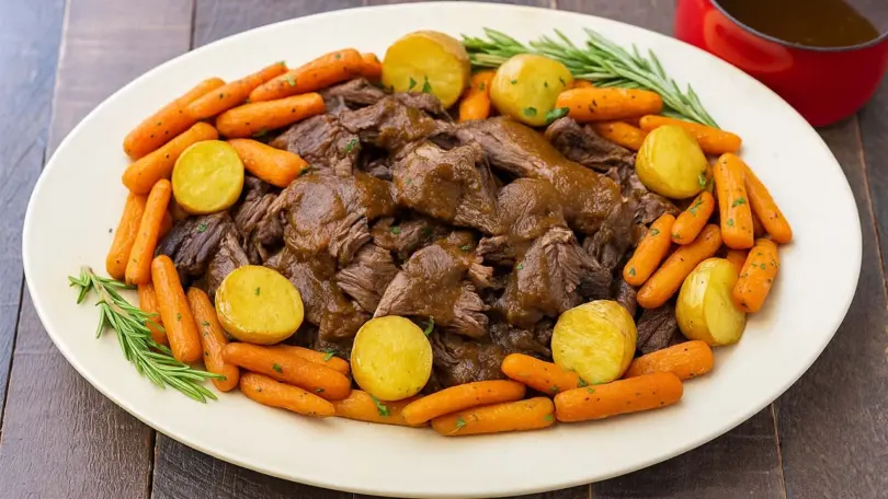 Instead of oven-roasting, transfer the seared beef, vegetables, herbs, wine, and broth to a slow cooker. Cook on LOW for 8–9 hours or HIGH for 4–5 hours. This version is excellent for busy holiday mornings when you want a stress-free Christmas dinner.